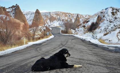 Keywords: dog animal black cappadocia road snow rocks winter landmark sky clouds white
