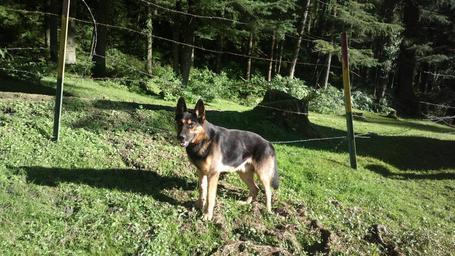 Keywords: dog animal woods pet german shepherd green hunting tree forest hunter nature