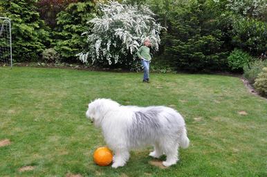 Keywords: dog ball young dog bobtail child young boy fellig play fun front yard garden meadow ball game