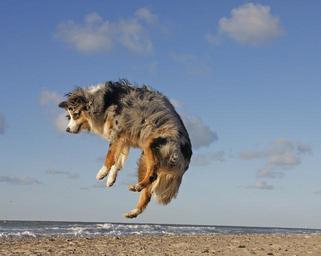 Keywords: dog beach australian shepherd jump sea coast