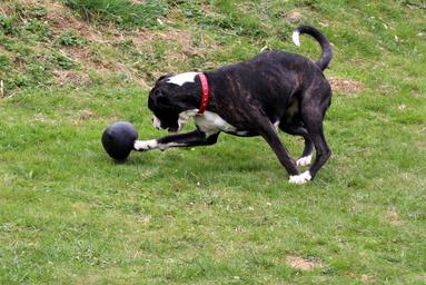 Keywords: dog boxer black and white pet play awakened run ball abut ball run after ball fun