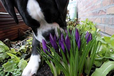 Keywords: dog boxer pet black and white snout nose curious smell crocus schwertliliengewaechs iridaceae