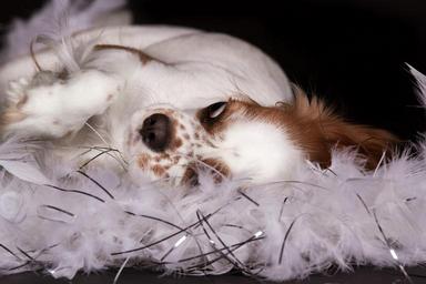 Keywords: dog cavalier king charles spaniel lying feather boa funny black