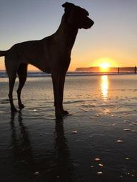 Keywords: dog coastline sunset sand beach vacation seashore ocean shore water nature sun canine relax