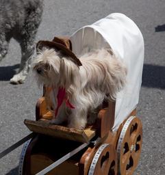 Keywords: dog costume parade fun cute pet show street canine colorful fur hair hat wagon