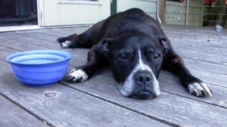 Keywords: Dog Days Of Summer, Featuring Miss Oreo.JPG en Shot With A Vivitar S830 16 1MP 2013-07-09 own Fancibaer cc-zero Uploaded with UploadWizard Staffordshire Bull Terrier Dog bowls Prone dogs head on ground Black-and-white dogs