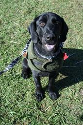 Keywords: dog dog wearing a coat animal coat pet canine cute black fur companion happy sitting outdoors grass sunlight warm