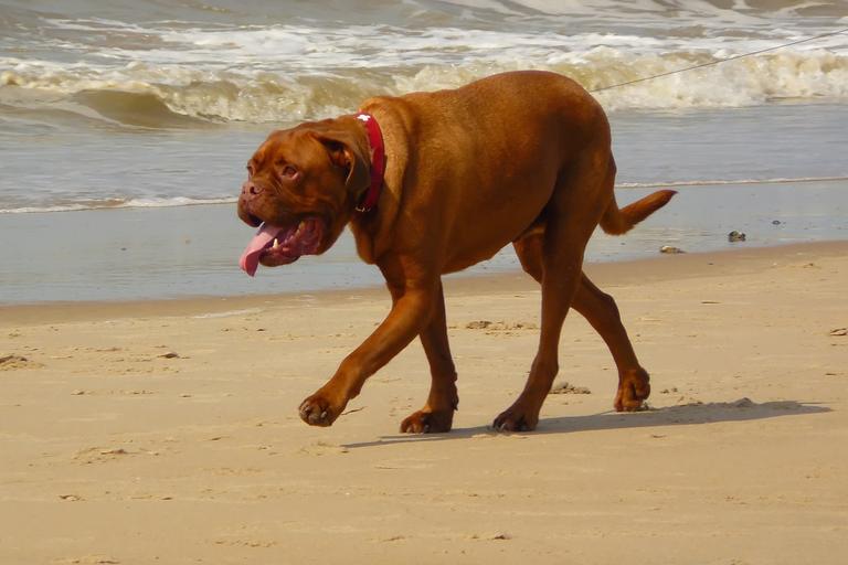 Keywords: dog dogs animal mammal good fur snout tongue pet fauna animal world water animals boxer boxer mongrel beach sea wave walk coast north sea sand wind windy pant summer hot necklace brown