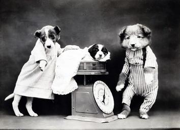 Keywords: dog dogs puppy dressed clothed cute vintage old photo weighing scales weighing parents baby image animals pet canine black white monochrome