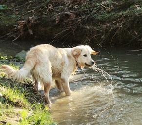 Keywords: dog golden retriever pet cute sand beige domestic animal creek puppy animal golden water forest drop green male