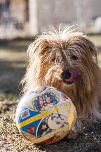 Keywords: dog hybrid medium ball tongue wuschelig pet play ball game snout ruffled portrait spring garden grass