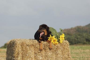 Keywords: dog mastiffs hay package summer sunflower field yellow agriculture pet supplies