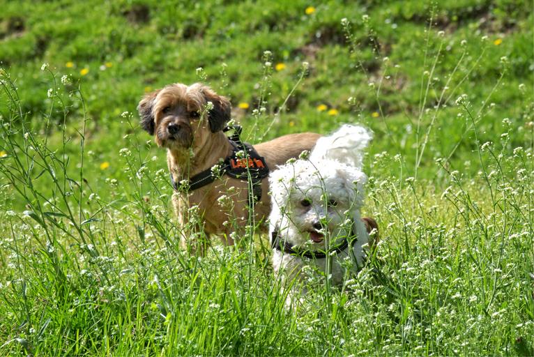 Keywords: dog meadow grass flower meadow together play look spring nature cute wildlife photography animal world