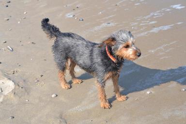 Keywords: dog on beach mongrel dachshund yorkshire terrier animal