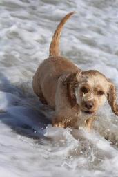 Keywords: dog on beach play fun joy movement summer sea wet cocker spaniel american cocker dog with toys wave coast surf nature dunes spray water splashes romp holiday