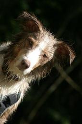 Keywords: dog pet australian shepherd wet portrait head oblique red merle