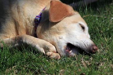 Keywords: dog pet rescue yellow labrador terrier hybrid outdoor summer spring fall nature animal canine golf ball fur paw nails nose whisker sun sunshine grass green teeth rural happy happiness content joy