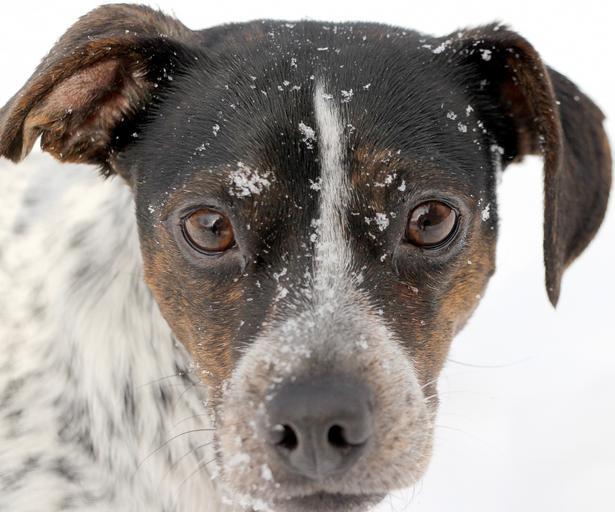 Keywords: dog portrait black white snow face nose play funny cute furry hound animal pet canine close-up