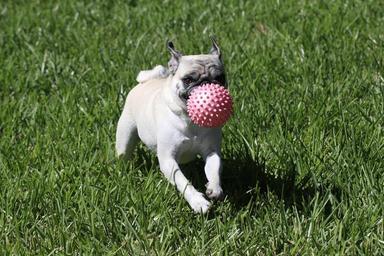 Keywords: dog pug playing puppy cute purebred breed friendship wrinkled playful happy paw