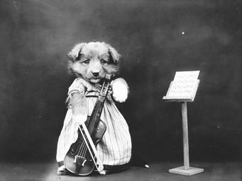 Keywords: dog puppy dressed clothed violin cute vintage old photo image animal pet canine