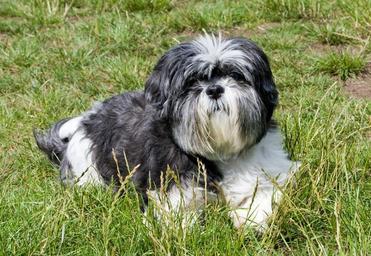 Keywords: dog shih tzu grey white laying grass cute beautiful canine pet breed pedigree image photo