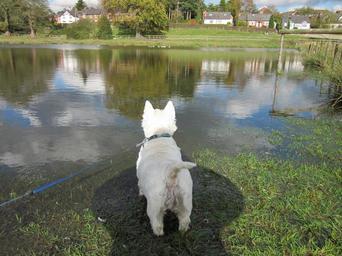 Keywords: dog westie west highland white terrier cute pet image outdoors sunshine canine water