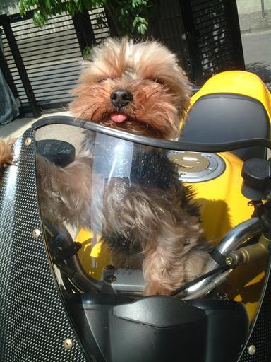 Keywords: dog yorkshire terrier bike yellow driver biker