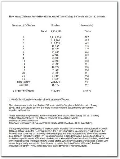 | Keywords: DOJ Stalking by Teams or Groups FOIA documents-Page2of3.jpg F O I A No 10-000169 -- Document 2 Click on the following document twice to enlarge it Also the previous document has annotations Move the mouse pointer over the image to see them View the cover letter from the U S Department of Justice F O I A Document 1 by clicking on the second image in File history below Stalking by Teams or Groups-DOJ FOIA documents-Page2of3 pdf en By letter dated March 22 2010 The U S Department of Justice Office of Justice Programs released two pages of responsive materials under the Freedom of Information Act F O I A regarding the subject of group stalking These materials clarify information previously published by the Department of Justice in a January 2009 special report titled Stalking Victimization in the United States This document F O I A Document 3 provides a breakdown by the specific number of stalkers identified by victims Note that a substantial number of victims were unable to quantify the exact number in the team or group of stalkers F O I A Document 2 clearly states that out of the category of 3 or more stalkers 41 2 or 185 050 such cases involved stalkers working together as a team or group Note that the facsimile number and legend OJP OGC indicating Office of Justice Programs Office of the General Counsel appear in the top margin of the document The cover letter Page 1 F O I A Document 1 is accessible at the bottom of his page Click on the document to view/enlarge it 2011-05-25 F O I A request for detailed information pertaining to stalking by teams or groups from the Department of Justice's January 2009 report titled Stalking Victimization in the United States To view the report go to http //www ncvc org/src/AGP Net/Components/DocumentViewer/Download aspxnz DocumentID 45862 To view the survey document used in the creation of the report the U S Census Bureau's Supplemental Victimization Survey 2006 go to http //docs google com/viewer a v q cache g6qLGWY7FawJ bjs ojp usdoj gov/content/pub/pdf/svs1_06 pdf+supplemental+victimization+survey+2006 hl en gl us pid bl srcid ADGEEShVJJcEtLBcMO8kpvtQbdVrbWqn0F10vhfIXuSE1EpxgmG8cOcgmGYmtUQF4XkUIDt5fQuLIN7d1axrkK7zmk3UkjaM-HRDoTHa2mRQr58XjjJQivyxhVM4XFNBi7YlKHk4cjzw sig AHIEtbTX_z7paOLVmFzdqwhk-cGD20tFlA U S Department of Justice Office of Justice Programs Office of the General Counsel Office of Justice Programs F O I A No 10-000169 Source Office of the General Counsel Office of Justice Programs U S Department of Justice; http //www ojp usdoj gov/about/foia/foia htm FOIA Contact is Dorothy Lee; 810 7th St NW Room 5400 Washington DC 20531; 202-307-0790; E-mail FOIAOJP usdoj gov Usage en Stalking PD-USGov Uncategorized 2013 July 21 Uploaded with UploadWizard DOJ FOIA ImageNote 1 27 1024 1052 326 1119 1481 2 thumb Note This document clearly shows that in the category of 3 or more stalkers 41 2 or 185 050 such cases involved stalkers working together as a team or group Note that the facsimile number and legend OJP OGC indicating Office of Justice Programs and Office of the General Counsel appear in the top margin of the document Click on the main document to see an enlarged image ImageNoteEnd 1 ImageNote 2 31 1065 806 56 871 1152 2 This is page 3 Document 3 of the F O I A request Go to File history below to view the cover letter Document 1 as well as page 2 Document 2 of the F O I A request Click on the desired document thumbnail below to view it then click on the displayed document to enlarge it View the letter from the U S Department of Justice by clicking on the second image in the file history below F O I A No 10-000169 ImageNoteEnd 2 ImageNote 3 529 669 319 56 871 1152 2 Click on the image to enlarge it ImageNoteEnd 3 ImageNote 4 40 27 763 62 871 1152 2 F O I A No 10-000169 View the cover letter from the U S Department of Justice F O I A Document 1 by clicking on the second image in File history below ImageNoteEnd 4 |