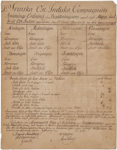 | Keywords: Dokument spisordning - Sjöhistoriska museet - SH 522.jpg sv Spisningsordning matsedel gällande för ostindiska kompaniets fartyg 1766 sv 1766 paper indian ink Sjöhistoriska museet Stockholm object history sv Matsedel för ostindiefarare från 1766 Veckans matsedel var bestämd i förväg På tisdagar fick besättningen exempelvis ärtor korngryn fläsk samt smör eller olja När vädret var dåligt fick de en större ranson brännvin än vanligt Text från Sjöhistoriskas utställning Shipping Shopping 2010 Spisordning för Ostindiska Kompaniet 1766 En spisordning är en lista över mat som manskapet ska få ombord Den här spisordningen användes på svenska ostindiefarare på 1760-talet Det var ärter och korngryn samt lite salt kött eller stockfisk varje dag Till det bröd och ett stop dricka öl om dagen I ett inventarium från samma år för kompaniskeppet Lovisa Ulrika nämns dessutom socker grönsaker frukt rött vin och levande kreatur - mat framförallt avsedd för befälet Text ur Sjöhistoriskas årsbok 100 TING 2010-2011 Spisordningen visar matsedeln för en vecka som gällde för alla kompaniets fartyg Varje dag serverades ärtor korngryn smör eller olja Till detta tillkom söndag måndag och torsdag torkat kött tisdagar fläsk och onsdag fredag och lördag stockfisk Sammanledes bestås på hvar Mann innan de komma till de varma Orterne En half Sill till frukost och alla dagar En half Jungfru Brännevijn hvilken portion dock lämnas åt Capitainen at efter omständigheterne uti elakt Väder föröka Observerandes at Spanska Bränvijnet som eljest är för starkt och för hälsan högst skadeligt med en Trediedel Vattn upspädes exhibition history credit line accession number http //digitaltmuseum se/011024831133 SH 522 place of creation Institution Sjöhistoriska museet SMM cooperation project PD-old-70-1923 Sjöhistoriska museet Images from Sjöhistoriska museet Swedish East India Company Documents |