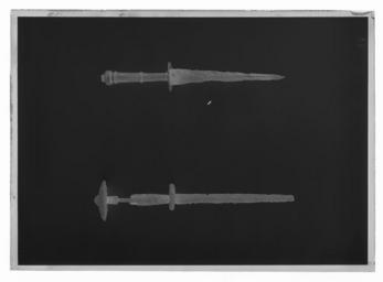 | Keywords: Dolk sammansatt - Livrustkammaren - 17594-negative.tif Sammansatt av ursprungligen ej samhörande delar Klingan sannolikt från sen medeltid Kavel av sengotisk typ Knapp och parerplåt sentida 1830-50 Monteringen av de olika delarna till av allt att döma utförd under sistnämnda tid Fäste av mässing Knapp pålödd kaveln och av rund vertikalt hoptryckt form utmed mitten bård hålkäl Nitknappen som är platt och med ojämnt flersidig kontur utgör huvudet till en i knappen inskruvad kort skruv Kavel koniskt avsmalnande mot klingbasen Rund överdelens mitt och nederdel en snedräfflad ring Mellan dessa ett yttäckande mönster av stående rektangulära fält med rut- och kryssmönster i låg relief och med spår av påhamrat silver Parerplåt slät rundat skivformig och vågrät utskjutande på vapnets utsida utmed kanten bård av runda hål Parerplåtens insida liten bredd 18mm rakt nedåtböjd och formad som en palmett Klinga tvåeggad illa medfaren och täckt av gravrost Eggsidorna ojämna mycket skadade Jordfynd original caption ca other date - 1400 1850 brass b1 - blankvapen - fäste material mässing - silver b4 - blankvapen - fästdekor material silver size mm 272 size mm 45 size mm 168 klinga size mm 25 klinga g 190 LRK Alexander E C G von Post Kapten 1843-1899 Stora Djulö Sverige place of origin original filename LN_B01852_004732 52444 inventory number LRK 17154 17594 CC0 Dolk sammansatt - Livrustkammaren - 17594 tif <gallery caption Different images of same object > File Skivdolk - Livrustkammaren - 77366 tif </gallery> |