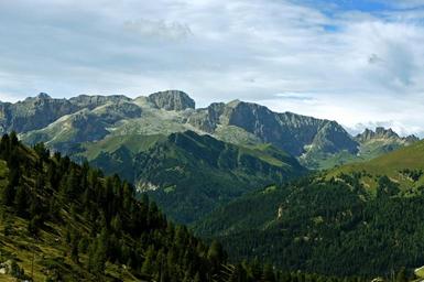 Keywords: dolomites mountains italy alpine south tyrol panorama landscape nature rock blue sky clouds view firs look further mountain peaks summit