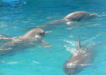 Keywords: dolphin swimming three pool water mammal aquatic intelligent bottlenose aqua playful play swim marine life