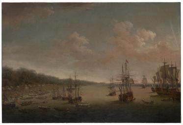 | Keywords: Dominic Serres the Elder - The Capture of Havana, 1762- the Landing, 7th June.jpg A depiction of an episode from the last major operation of the Seven Years War 1756 “63 It was part of England ™s offensive against Spain when she entered the war in support of France late in 1761 The British Government ™s response was immediately to plan large offensive amphibious operations against Spanish overseas possessions particularly Havana the capital of the western dominions and Manila the capital of the eastern Havana needed large forces for its capture and early in 1762 ships and troops were dispatched under Admiral Sir George Pocock and General the Earl of Albemarle The force which descended on Cuba consisted of 22 ships of the line four 50-gun ships three 40-gunners a dozen frigates and a dozen sloops and bomb vessels In addition there were troopships storeships and hospital ships Pocock took this great fleet of about 180 sail through the dangerous Old Bahama Strait from Jamaica to take Havana by surprise Havana on Cuba's north coast was guarded by the elevated Morro Castle which commanded both the entrance to its fine harbour immediately to the west and the town on the west side of the bay This painting shows the encampment of the British troops at Cojimar Bay after landing some six miles east of Morro Castle on 7 June in preparation for the siege To the left are the rows of tents of the British camp with boats moving to and fro between storeships and elements of Pocock's fleet flying blue on the right between 1770 75 Oil canvas cm 127 6 188 6 Institution National Maritime Museum object history credit line On loan to the National Maritime Museum Greenwich London from a private lender accession number BHC0409 http //collections rmg co uk/collections/objects/11901 html Royal Museums Greewich PD-old-100 Dominic Serres Paintings of Battle of Havana Cuba in the 1760s 18th-century paintings of naval battles Paintings in the National Maritime Museum London |