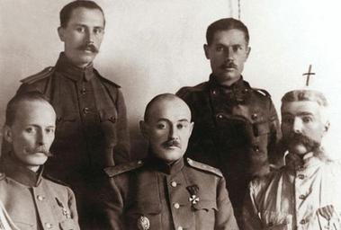 | Keywords: Don Army Command 1919.jpg Командование вто ой состав Донской а мии фев аль 1919 Г ажданская война в России 1917-1922 Сидят слева нап аво начальник штаба Донской а мии гене ал-лейтенант Кельчевский А К командующий Донской а мией гене ал-лейтенант Сидо ин В И командующий Восточным ф онтом а затем 4-м Донским ко пусом гене ал-лейтенант амонтов К К после его сме ти в фев але 1920 года владелец фотог афии на исовал над его головой к ест Стоят слева нап аво пе вый гене ал-ква ти мейсте штаба Донской а мии полковник Кислов Г Я начальник опе ативного отделения гене ального штаба полковник Доб ынин В В Don Army Command second part February 1919 The Civil War in Russia 1917-1922 Sitting from left to right Chief of Staff of the Don Army Lieutenant-General Anatoly Keltchewsky commander of the Don Army Lieutenant-General Vladimir Sidorin commander of the Eastern Front and then of the 4th Don Corps Lieutenant-General Konstantin Mamontov The cross over Mamontov's head was drawn by the photographer after he died in February 1920 Standing from left to right First Quartermaster-General of Staff of the Don Army Colonel Gregory Kislov chief of Operation Department of the General Staff Colonel Vladimir Dobrynin File Командование Донской а мии jpg 2015-05-09 VladiMens PD-old <gallery>File Командование Донской а мии jpg</gallery> cropped retouched contrasted enlightened and sepiaded VladiMens Konstantin Konstantinovich Mamontov Don Cossacks |