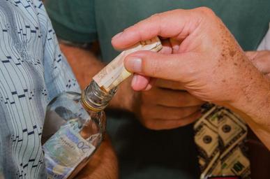 Keywords: donation money bottle hand