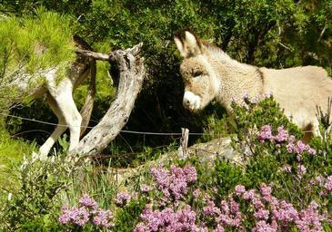 Keywords: donkey animal head ears rural beast of burden animals mammal animal world fauna south plant nature flora road green leaves summer blossom bloom bloom flowers purple olive tree fence mallorca fur ass portrait cute
