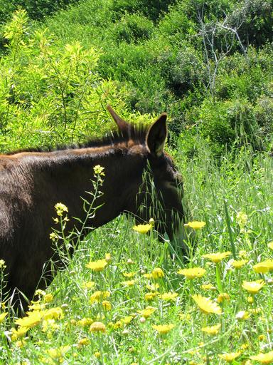 Keywords: donkey cyprus animal brown field yellow flowers
