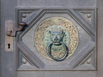Keywords: door doorknocker metal wood ornament call waiting lion fitting ring old door old artfully church door