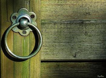 Keywords: door front door house entrance input goal wood pattern metal fitting frame door handle ring metal antique handle shiny rosette stainless steel grain wood grain capping entry garden door wooden door closed close up close