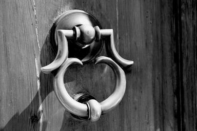 Keywords: doorknocker call waiting door black and white old building make up intake
