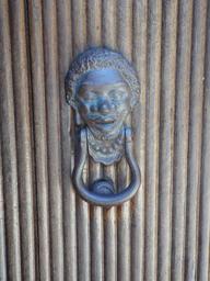 Keywords: doorknocker face call waiting door intake brass metal input tap old