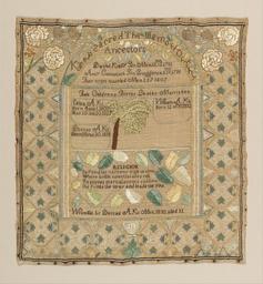 | Keywords: Dorcas A. Kelly, American - Family register sampler - Google Art Project.jpg 1818 1881 American 6719006 Dorcas A Kelly 1818 - 1881 /collection/cooper-hewitt-national-design-museum/artwork/family-register-sampler-dorcas-a-kelly-american/6712596/ 75383 Dorcas A Kelly American /artist/dorcas-a-kelly/6815419/ 6815419 /collection/cooper-hewitt-national-design-museum/ Cooper-Hewitt National Design Museum 3644669 http //www cooperhewitt org/ /collection/cooper-hewitt-national-design-museum/artwork/family-register-sampler-dorcas-a-kelly-american/6712596/ 1830 1830 Medium silk embroidery on linen foundationTechnique embroidered in cross satin and stem stitches on plain weave foundation By 1941 Mrs Henry E Coe Eva Johnston Coe 1941 Museum for the Arts of Decoration of the Cooper Union 6712596 False 1830 1941-69-70 http //collection cooperhewitt org/view/objects/asitem/id/75383 Bequest of Mrs Henry E Coe Family register sampler 1830 1840 1830 False 0 92578125 Object family-register-sampler-dorcas-a-kelly-american Family register sampler f Ethel Stanwood Bolton and Eva Johnston Coe American Samplers Boston The Massachusetts Society of the Colonial Dames of America 1921 183 H x W 49 x 47 cm 19 5/16 x 18 1/2 in Wrought by Dorcas A K Men 1830 aged 11 Medium silk embroidery on linen foundationTechnique embroidered in cross satin and stem stitches on plain weave foundation By 1941 Mrs Henry E Coe Eva Johnston Coe 1941 Museum for the Arts of Decoration of the Cooper Union special url_id tgH5AcYvfBGUwQ PD-old-100-1923 1881 Google Art Project works by Dorcas A Kelly Textiles in the Cooper “Hewitt Smithsonian Design Museum 1830s samplers Google Art Project works in Cooper-Hewitt Smithsonian Design Museum 1830 works |