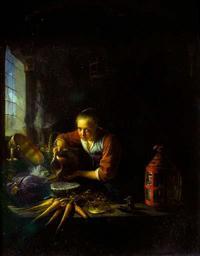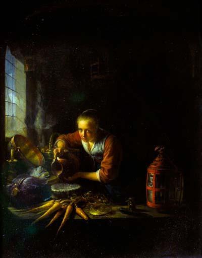 | Keywords: Dou, Gerard - La Cuisinière Hollandaise - 17th century.jpg Artwork creator Gerard Dou La Cuisinière Hollandaise or La Cuisine hollandaise 3 <sup>rd</sup> quarter of the 17th century oil canvas 36 H × 27 3 L cm Musée du Louvre département des Peintures Paris http //www culture gouv fr/public/mistral/joconde_fr ACTION RETROUVER FIELD_98 LOCA VALUE_98 Paris 20 NUMBER 79 GRP 1787 REQ Paris 20 3aLOCA 20 USRNAME nobody USRPWD 4 24 2534P SPEC 1 SYN 1 IMLY MAX1 1 MAX2 1 MAX3 100 DOM All www culture gouv fr ” JOCONDE http //ramblingspoon com/blog/wp-content/uploads/2008/10/gerarddou-la-cuisiniere-hollandaise jpg INV 1217 Other versions PD-old-100 17th-century genre paintings Oil paintings of women Females in art in three-quarter views Female arms in art Female cooks in art Louvre by room - Northern Schools - Room 35 Dou People in kitchens in art Pouring in art Paintings by Gerard Dou 1640 Young Woman Pouring Water Food preparation in art 17th-century professional activities in painting 17th-century domestic activities in painting Uploads by Mattes from external sources |