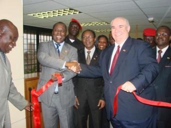 | Keywords: Douala embassy ribbon cutting.JPG Charge d'Affaire Rick Nelson right and Governor Gounouko Haounaye of the Littoral Province after the ribbon cutting at the opening of the U S Embassy branch office in Douala Cameroon From the http //yaounde usembassy gov/uploads/images/dGpvfWcShL5ov0j9yZqjrA/DSC01144 JPG U S Embassy website Politicians of Cameroon Embassies of the United States People of Cameroon PD-USGov Ribbon-cutting ceremonies | ||||