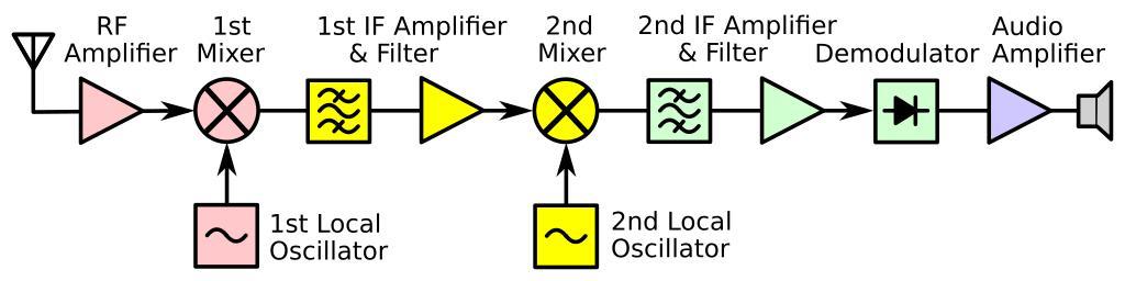 | Keywords: Double-conversion superheterodyne receiver block diagram.svg double-conversion superheterodyne receiver a more sophisticated version of the superheterodyne receiver invented in 1918 by Edwin Armstrong and used in many modern radio receivers In order to achieve both good adjacent channel selectivity and image rejection the double-conversion receiver uses two intermediate frequencies IFs The incoming radio frequency RF signal from the antenna is first mixed with a sinusoidal signal from the 1st local oscillator LO to give a high 1st IF frequency Since the separation between the RF and the image frequency is twice the 1st IF this high IF results in wide separation between the RF and the image allowing the image filter in the RF amplifier to reject the image Then this 1st IF is mixed with a 2nd local oscillator frequency to give a lower 2nd IF This lower IF allows the 2nd IF filter to have a narrow bandwidth giving the receiver good adjacent channel selectivity Then the 2nd IF is demodulated to extract the modulation from the radio frequency signal and the audio is amplified and applied to the speaker 2016-01-06 own Chetvorno other versions cc-zero Superheterodyne circuits Uploaded with UploadWizard |