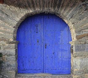 Keywords: double doors blue entrance exit archway arch building architecture home residential doorway wooden closed bricks structure