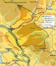 Keywords: Dovre map.jpg en Map of Dovre municipality Norway Own Jensens 2008-11-23 Maps of Oppland Dovre