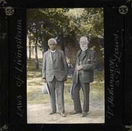 | Keywords: Dr Robert Laws and Dr Alexander Hetherwick, Malawi, ca. 1810-ca. 1925 (imp-cswc-GB-237-CSWC47-LS5-1-055).jpg en <br> Dr Robert Laws and Dr Alexander Hetherwick Malawi ca 1810-ca 1925 Photograph of the Scottish missionaries Dr Robert Laws and Dr Alexander Hetherwick Dr Alexander Hetherwick 1860-1939 was ordained for service with the Blantyre mission in Malawi in 1885 Along with Robert Laws he was one the main architects of the Church of Central Africa Presbytery which was inaugurated in 1924 ; This belongs to a series of Church of Scotland Foreign Missions Committee lantern slides relating to Dr Robert Laws 1851-1934 the Scottish Missionary In 1875 inspired by David Livingstone 1813-1873 Laws travelled to Malawi and was involved in the foundation of the mission station of Livingstonia on the shores of Lake Nyasa During the succeeding 50 years he also established a network of hundreds of schools In 1908 Laws was elected moderator of the General Assembly of the United Free Church of Scotland Photographer Unknown Subject personal name Laws Robert 1851-1934; Hetherwick Alexander 1860-1939 Filename imp-cswc-GB-237-CSWC47-LS5-1-055 tif Coverage date 1910/1925 Part of collection International Mission Photography Archive ca 1860-ca 1960 Type images Part of subcollection Photographs from the Centre for the Study of World Christianity University of Edinburgh U K ca 1900-ca 1940s Repository name Centre for the Study of World Christianity Archival file impaunpub_Volume7/1558 url Repository address The University of Edinburgh School of Divinity New College Mound Place Edinburgh EH1 2LX United Kingdom Geographic subject country Scotland; Malawi Format aacr2 1 lantern slide 8 x 8 cm Geographic subject continent Africa Rights Contact the repository for details Part of series Laws of the Pioneer LS5/1 Repository email divinity-CSWC ed ac uk Subject lcsh Keyword Clergy; Missionaries Date created 1910/1925 Publisher of the digital version University of Southern California Libraries Subject aat genre portraits Format aat lantern slides Legacy record ID impa-m68642 Access conditions http //www ed ac uk/schools-departments/divinity/research/centres/world-christianity/collections-resources File GB 237 CSWC47/LS5/1/55 1910/1925 author http //digitallibrary usc edu/cdm/ref/collection/p15799coll123/id/64678 PD-old-70-1923 Magic lantern images Images from USC Digital Library uploaded by Fæ International Mission Photography Archive ca 1860-ca 1960 |