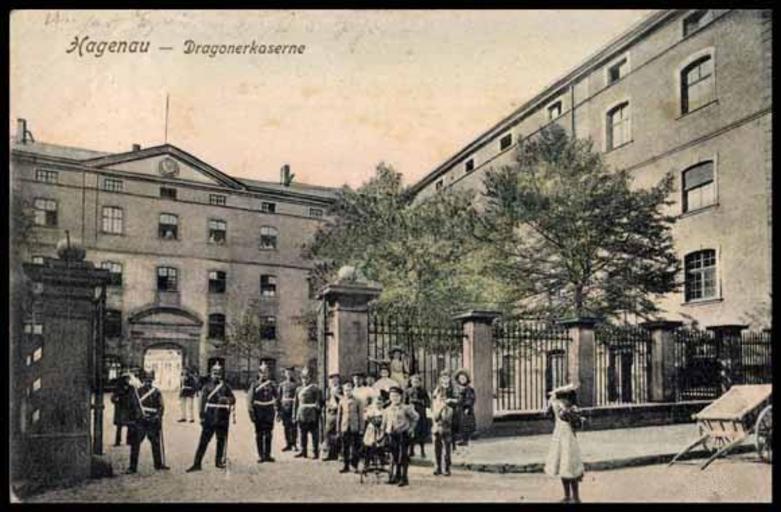 Keywords: Dragoner Kaserne Hagenau.JPG de Dragoner Kaserne in Hagenau/Lothringen alte Postkarte author ca 1900 PD-old Barracks in France Buildings in Haguenau Kaserne in Hagenau