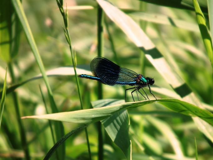 Keywords: dragonfly insect halm grass bank water river close summer green shiny wing transparent filigree